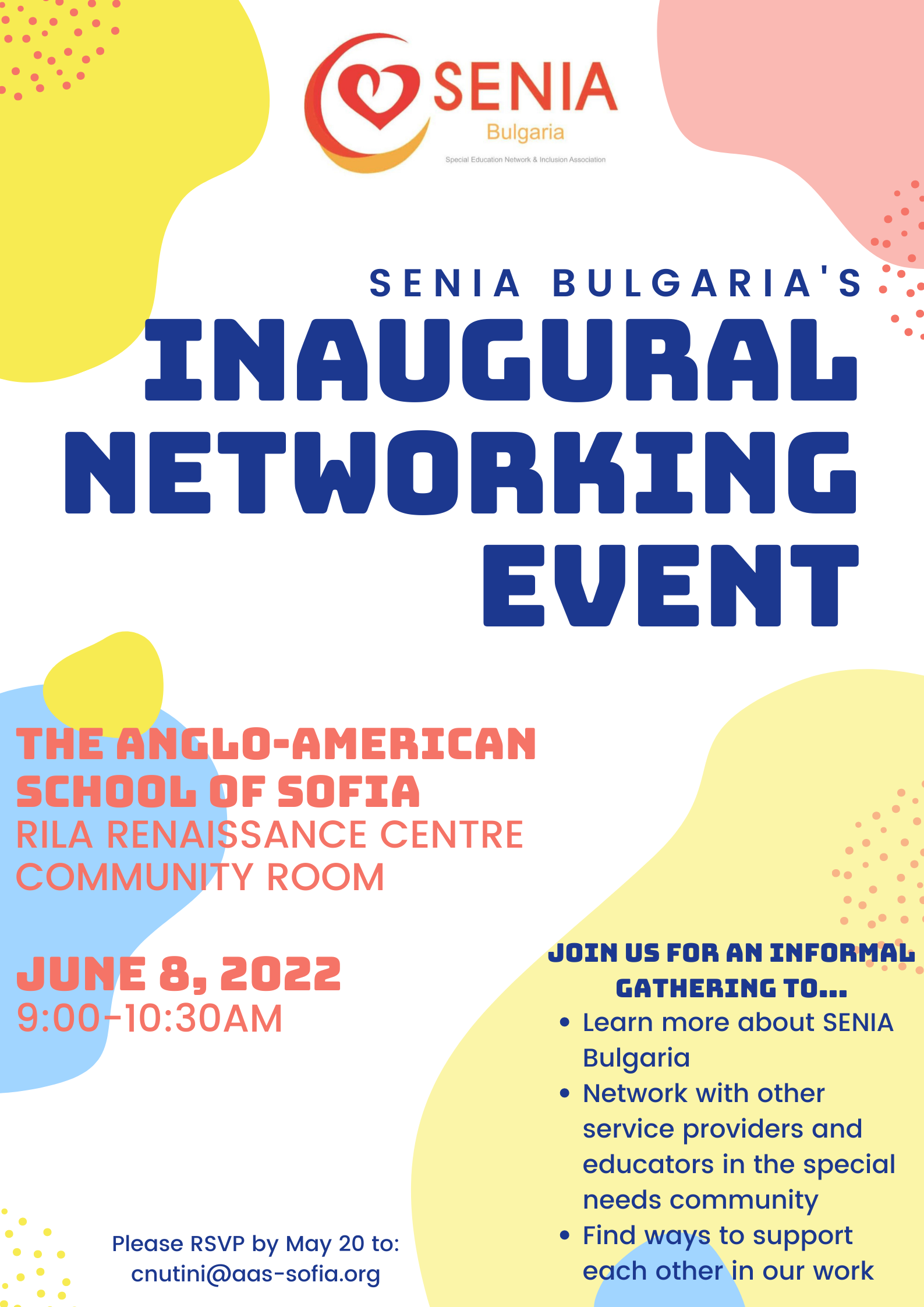 We are proud to invite professionals and educators from across Sofia to attend SENIA Bulgaria’s first networking event. Attendees will learn more about SENIA Bulgaria and our mission, connect with other professionals who work with the special needs community, and learn how we support each other in our vision for a more inclusive world.
